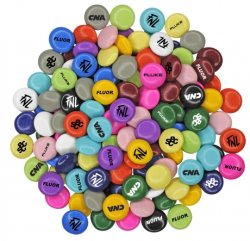 Each mini Chocolate mint provides a custom imprint area of 3/8" in diameter.  Order all one color or any any assortment of the 15 different available colors. There are 410 mini mints to a pound and the minimum order is only 6 pounds.