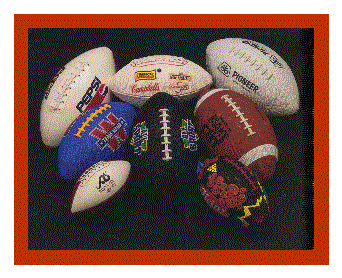 Pictured below are rubber footballs and handsewn synthetic footballs with custom imprints. The rubber footballs are available in full size of 11"-11 1/2", medium size 10 1/2" -11" and small 10"-10 1/2". These have the finest rubber cover with raised laces, 2 ply 100% butyl bladder and it is available in brown or custom colors. The handsewn synthetic footballs are available in full size of 11", medium size 9 1/2", small 8 1/2" and mini 6 1/4". These footballs have synthetic leather pebble finish ans is available with one smooth white panel for autographs. Minimum order with a custom imprint is 120 footballs.