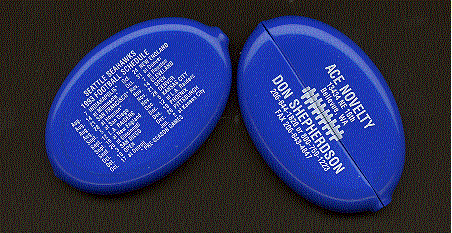 Here is one of our most popular items over the years. It is a simple coin purse that everybody just loves to use and have a football schedule so readily available at hand. It makes real cents to consider this item for your next football promotion. These coin purses come in a variety of colors and give you a great two side imprint. The actual size of the coin purse is 3" in length. The minimum imprintable order with your custom imprint is only 250.