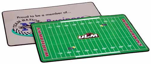 Our football door mats measure 20" X 30" and have rubber backing. You can imprint your logo and text anyplace on the product and the minimum quantity is only 12. The football design is a stock design so you can place your custom imprint anywhere you may want on the gridiron door mat.