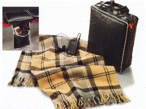 This kit loves sports. The blanket is 100% acrylic, machine washable and dryable. It's 50" X 50" in tan plaid. The deluxe vinyl case zips apart to form two cushions with an inside pocket to hold your program and other essentials between your legs. The kit includes a General Electric AM/FM stereo headset radio. Minimum quantity is six.