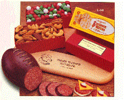 Here is a tasty treat for those tailgater parties before that all important football game. Yes that is a football which actually a one pound beef summer sausage that is seasoned and smoked to perfection. The Tailgater comes complete with a half-pound of mild cheese, six ounces of fresh-roasted deluxe mixed nuts, a half pound of refreshing gourmet mints and a box of Bremner sesame wafers. The walnut and hard maple cutting board comes complete with your logo and imprint. Minimum imprinted order is only 12 Tailgaters. This is only one of our food items that can be used for your football parties.