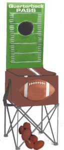 The Football Toss Cooler holds 24 to 36 cans or bottles and supports up to 50 pounds including ice in the cooler. It measures 16" wide X 16" deep X 30" tall with the backboard height of 60". Each set comes with three mini footballs to toss thru the hole in the backboardarea. Comes with easy to setup hardware and no tools are required. Minimum quantity of the stock FootballToss cooler is only one! Also available in a Basketball or Baseball version.