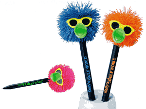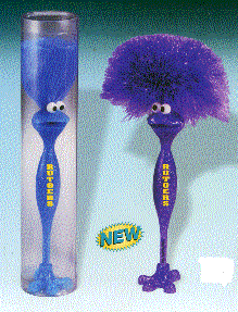 This item is a great fun addition to any desk. A great computer duster that sits on one foot. Pull of his foot and you have a pen. A two in one item that is a great trade show give-away. Available in blue or purple only. The item is 9" long with an imprint area of 1" wide X 3/8" high. Minimum imprintable quantity is 50.