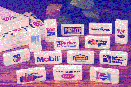 Our custom designed dominoes can have your name and logo of your business, association, club or other enterprise permanently printed into the backs of each of the 28 dominoes in a set. Dominoes are a most effective, memorable and unique advertising gift idea for your customers, employees and prospects. Excellent for merit and safety award programs. Puremco dominoes are the only dominoes made in the United States of America and the only dominoes in the world with photographic custom printing. These beautiful dominoes are made from a special plastic marble resin and then polished into a silky smooth texture with the look and feel of real ivory. Each set is packaged in an attractive, heavy duty, alligator-print, white cardboard gift box. Game rules are enclosed with each set. Optional custom cases are available in wood, plastic and leatherette at extra cost. The minimum custom imprintable order is only 12 sets !!