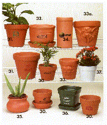 These Terra Cotta and Plastic Pots can be imprinted with your imprint in a minimum quantity of 144. They range in size from a 4" to a 9" pot. The #30 terra cotta pot is a 4". The #31 is a terra cotta 6". The #32 is a 7" terra cotta pot.. The #33 terra cotta iis a 7" Angel Pot which is printed on the rim. The #34 is a 9" Sand Jar or Wine Crock in terra cotta. The #35 is a 4" terra cotta Wash Pot. The #36 is a 5" Square plastic pot with a clip on saucer. The #37 is a round 4 1/2" Plastic pot with a clip on the saucer.