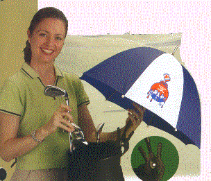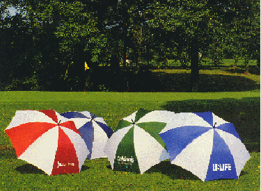 Need a good quality golf umbrella ? We have a large collection of umbrellas to chose from. Illustrated below are several samples of 37" and 40" which are our two most popular sizes. Our 37" model gives you an imprint area of 8"X 8" while the 40" model has a 10" X 10" area for your imprint. There are many color combinations available both in an alternating color combination and also in solid colors. Our 37" model has a rib of 27.5", an arc of 55" with a diameter of 44.5". The 40" golf umbrella provides you with a 32" rib, a 64" arc and a diameter of 54". These great umbrellas are safe on the course with a tough fiberglass and genuine wood handle and a double rib construction.Need a free umbrella catalog? Give ius a call at 800 960-9080.