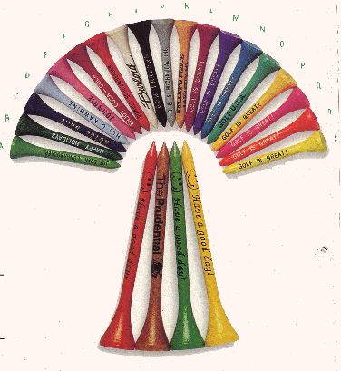 We can provide you with either plastic or wood tees and our minimum amount of imprintable tees is 1000. Tees pictured below are made of lacquered hardwood and are available in many colors as illustrated in the picture. The tees can be printed in black, red, blue, green (both light & dark), orange, brown or white. The tee sizes below are either 2 1/8" which are imprinted using the hot stamping method or the slightly larger 2 3/4" tees which are ink imprinted. The Novel-tee 4 1/2" long tee minimum order is a quantity of 250 and will be the hit at any course when you give them out as a tee prize.