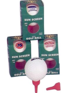 Sunscreen lotion in golf ball with tee shape cap. A necessary health protection product most golfers forget to bring. Simulated golf ball contains 1.1 oz. of SPF 18 lotion with a coconut scent. Remove tee cap and squeeze ball to release concentrated, non-greasy protection. Suitable for outdoor use by all man, women or child age group. 1 - 2 logo or typeset message imprinted on top area of 7/8".  Less than $ 4.60 each in minimum of 50.