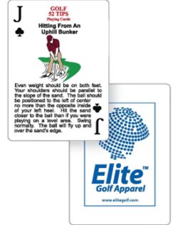 Golf - Playing cards with 52 tips on popular topics. We've done the research, you get the rewards. A resource for information, helpful hints and tricks of the trade for your golf game all collected in a deck of authentic playing cards. Each topic-specific tip appears on the card face and your logo appears on the white card back.  Less than $ 5.75 in the minimum order of 50 decks.