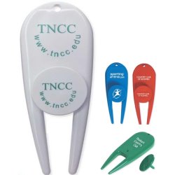 2-in-1 golf accessory divot ball marker. Repairs divots and marks your ball. Made of durable plastic resin. The imprint can be on the fixer in an imprint area of 1/2" X 3/4" or on the marker in an area of 1/2" in diameter. Available in Blue, Green, Red or White.  Less than  $ .60 each in the minimum of 500