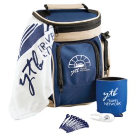 Golf cooler kit without golf balls. Includes golf cooler bag, 15" x 18" golf towel with grommet and hook, eight 2 3/4" tees, divot repair tool and collapsible can holder. Price per pack is less than $ 23.50 in the minimum of 36.