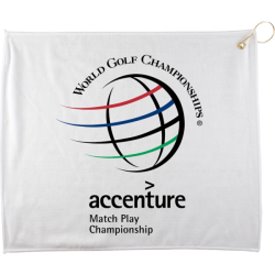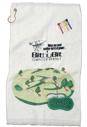 Here is a golf towel that measures 25" X 13" and it comes with a tee holder on the towel and a scrub brush. The imprintable area on the towel is 9" X 4 1/4". Minimim imprintable quantity is 50 and they are less than $ 7 each in that quantity.