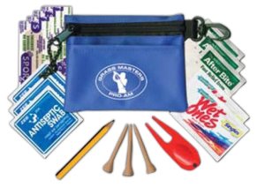 This 5" X 4" Golf Kit is a great give-away for golf tournaments, trade shows, golf related businesses, golf associations and golf organizations. It is available in Black, Royal Blue, Pink or Red. Each kit consists of 3 golf tees, 1 divot tool, 1 golf pencil, 2 antibacterial wipes, 2 antiseptic swabs, 3 afterbite sting swabs and 4 bandage strips. Your custom imprint goes in the imprintable area of 3" X 1 1/2". Less than $ 5.25 each in the minimum of 100. We have a total of 10 different types of golf kits that are currently available.