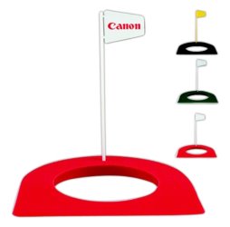 This mini putting cup measures 6 7/8" X 6 7/8" and provides an imprint area of 1 1/2" X 3/4". It is available in your choice of black, green and red and the flag colors can be either white or yellow, In the minimum imprintable quantity of 100 they are less than $ 2.50 each.