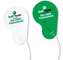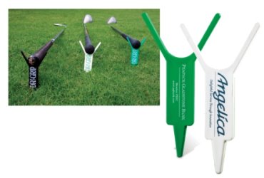 The Golf Club holder keeps your clubs off of the wet grass and dirty areas. Can also be used as a divot tool. Available in green or white. Less than $ 1.35 each in the minimum imprintable quantity of 100.