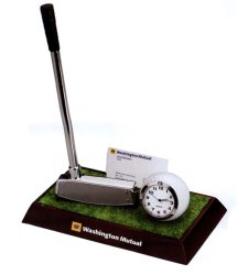 This unique Golf clock has an attached golf club pen holder (pen included), a business card holder and wooden base. It measures 5" X 2 1/2" X 3 1/4". It provides a custom imprint area of 4" X 2". Great product for tournament volunteers and sponsors! Less than $ 30.00 each in the minimum of 50.