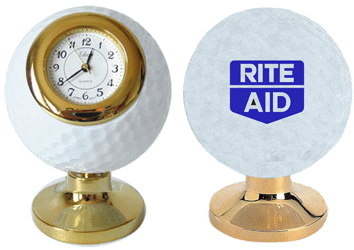 This golf ball clock measures 1 3/4" X 2 1/2" and provides an imprint area of 1" X 1". In the minimum imprintable quantity of 75 they are less than $ 16.00 each.