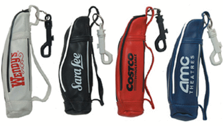 The mini golf bag holds up to 3 golf balls, cell phones or sunglasses and has a zippered closure. You can clip it to your golf bag or your waist. It measures 2" X 6 1/2" and is available in blue, red, white or black. It provides an imprint area of 2 3/4" X 7/8". In he minimum imprintable quantity of 150 it is less than $ 3.75 each.