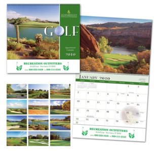 How about a golf calendar with your custom imprint ? Illlustrated below is just one of the many golf related calendars that we have available. The golf calendar that appears below is a 10 1/2" X 18 1/4" Golfing calendar. Golf is one of the fastest growing sports among businesspeople.. Reach the golfing executive right in his office with your advertisement. These golf calendars are certain to be noticed by all. Minimum quantity on the calendar pictured below is 300 and they are less than $ 1.25 each with your custom imprint.