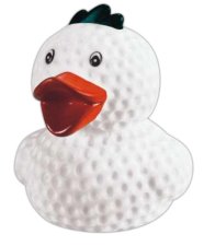 The golfing duck on the left measures 3" long X 3" high X 2 5/8" wide and provides an imprint area of 7/8" wide X 1/2" high. It is also available as a keychain. Middle picture is the Birdie Golf Ball Duck that is 3" long X 3" wide X 3 1/2" high with an imprint area of 1' wide X 3/8" high. It is also available as a keychain. The far right picture of the Golfer duck is 3 1/2" long X 3 7/16" wide X 3 3/16" high with an imprintable area of 1 1/8" wide X 1/2" high. Minimum order on the Golf rubber ducks is 50.