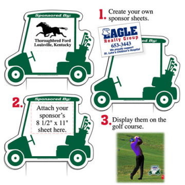 Made from white, all-weather, corrugated plastic that measures 23" X 19 1/2" and is 3/16" thick and printed on one side in Dark Green. The Golf Hole Sponsor signs come with 1 sign and 2 rods. The rods are 24" heavy-duty, spring steel wire. In the minimum of 20 they are less than $ 10 each.