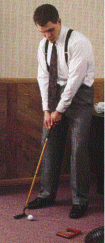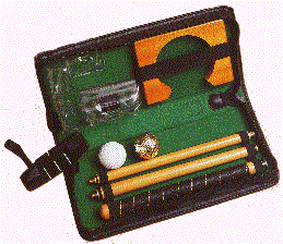 Here is a great award, gift or incentive item for potential golfers and travelers alike. The 7 piece travel golf set consists of a 4 piece detachable putter with a professional offset hosel and a custom rubber grip. It also includes a standard round white golf ball and a gold plated golf ball and a oak finish wood plate cup. Each unit is beautifully packaged in a vinyl case with a zipper and handle. The case size is 5 1/2" X 13" X 1 3/4" with lots of area for your custom imprint on the outside front of the case .The minimum imprintable quantity is 24.