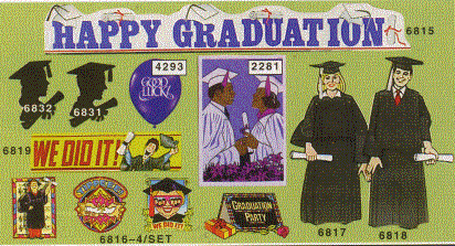 Pictured at the top is the #6815 - 8 1/2" X 66" cardboard Happy Graduation banner. From left to right in the middle area is the #6832 Female and #6831 Male - 12" Graduate Silhouettes, the #4293 - 11" Good Luck Balloons, the #2281 - 22" X 32" Graduate poster, the #6817 Female and #6818 Male - 36" Jointed Cutouts. In the bottom area the picture shows the # 6819 - 8" X 31" - We Did It banner and the #6816 - 16" set of four Graduation Cutouts.