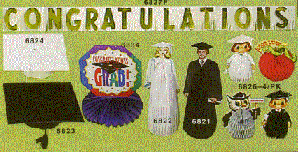 The #6827F at the top area is a 5" X 6 foot Congratulations banner. From left to right under it is the # 6825 White and # 6824 Black - 9" paper Graduate Hats, the #6834 - 10" Congratulations Grad Tissue Centerpiece, the #6822 Female and the # 6821 Male- 13" Tissue Centerpieces and the #6826 - 5" mini cardboard and tissue decorations with 4 in a pack.