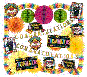 This Graduation Decorating kit consists of 2 - 14" Tissue Balls, 1 - 19" Tissue ball, 4 - 18" Tissue Fans, 2 - 25" Tissue Fans, 2 - 23" Congratulations Signs, 8 - 16" Graduation Cutouts, 2 - 6 foot Congratulations Banner and 4 - 12" Arcade Garlands.