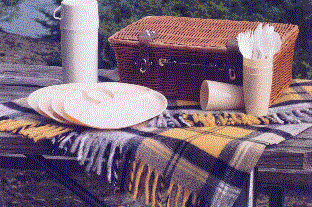 This pack includes a 100% acryclic blanket in look-at-home-anywhere tan. Plus it's machine washable and dryable 45" X 50". The pack includes an Alladin one pint insulated bottle, and eating utensils for four. The whole package fits in a practical and attractive synthetic wicker basket measuring 16" X 10" X 7". Minimum quantity is only six.