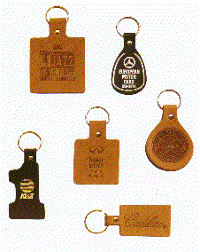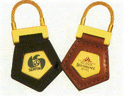 These keyrings are available in either genuine black or tan leather. Minimum quantity on any of those pictured below is 250. They range in size from the large square leather key ring at 2 1/4" X 2 1/4" and an imprint area of 2" X 2" to the teardrop shape key tag that is 1 1/2" X 2" and provides an imprint area of 1 1/8" X 1 5/8"..
