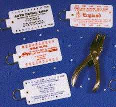 These key tags come with a punch where one can punch the person's keytag as they reach various levels of buying such as a record store, fast food restaurant, video store or lubrication store. The punches are free with all orders of 250 and you have a choice of diamond, heart or kite shaped punch. All kinds of possibilities with this truly unique keytag.