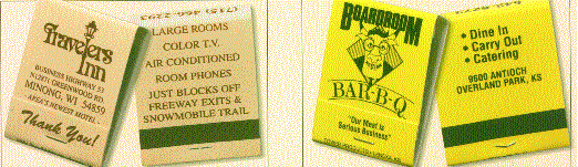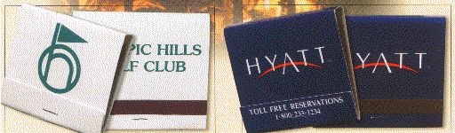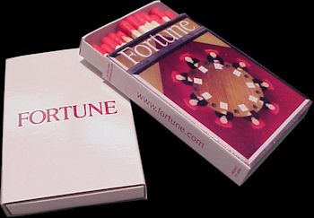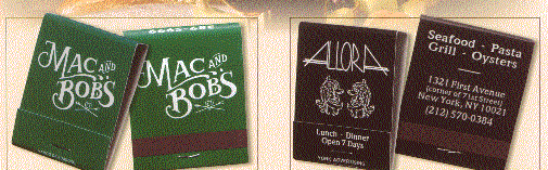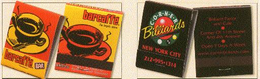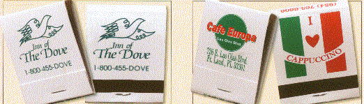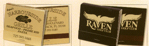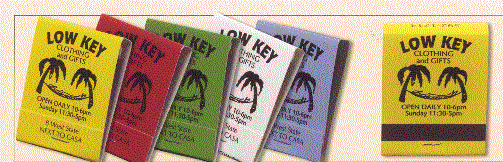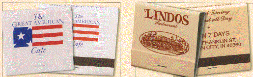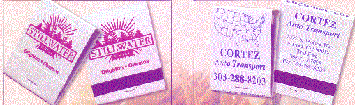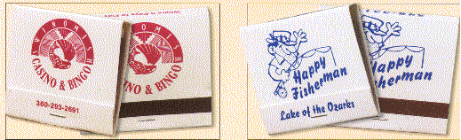 We have many types of matchbooks and matchboxes to chose from. We have pictured below 20 and 30 splint matchbooks and various types of matchboxes all of which can have your custom imprint. If you would like a free catalog please call us at 800 960-9080 or 206 285-5359 (Seattle) or email us at donace@promotionalproductsandideas.com