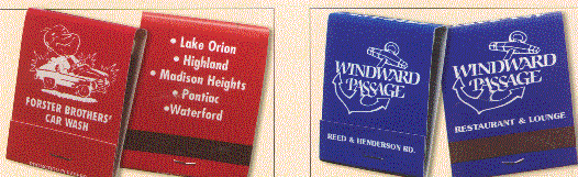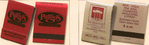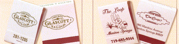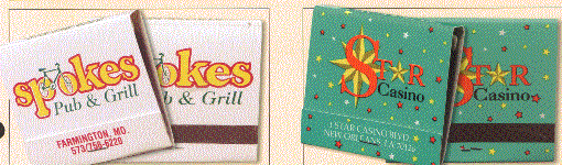 The left picture shows an example of the 20 stem matchbook with Black ink on a Red background and on the right is an example of Burgundy imprint on a Gray background. Minimum is one case of 2500 matchbooks .