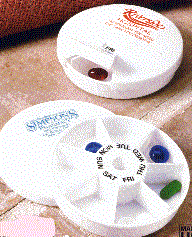 This unique design makes daily pill dispensing easy. Simply turn the top to line up slot with the appropriate day, then lift the tab to dispense. Holds one or more pills for each day of the week. Raised lettering on days. Convenient size is 3" diameter X 3/4" tall and provides an imprint area of 1 1/8". Minimum imprintable quantity is 250.