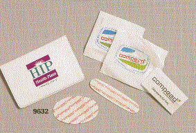 This handy. vinyl tri-fold kit fits in a briefcase, pocket or purse and holds 4 Curad adhesive strips, 2 Bayer aspirin packets, 2 antiseptic towelettes and 2 antacid packets. The actual size is 4 3/4" X 2 3/4" with an imprintable area of 3 1/3" X 2". Minimum imprintable quantity is 100.