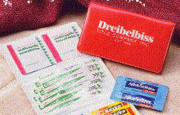 The vinyl case folds open for immediate access to first aid components, then folds up to fit neatly in your glove compartment. Contains forehead thermometer, scissors, Alka Selzer, Tylenol, antiacid, adhesive tape and bandages. The actual size of the pack is 5 5/8" X 4 1/4" and provides an imprint area of 4 1/2" X 3". The minimum imprintable quantity is 150.