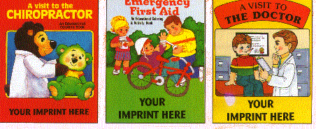 We have various Medical related coloring books available and each of these coloring books has a large imprint area on the front cover for your imprint. Each of those pictured below is 8 1/2" X 11" in size and has 16 pages of fun. The Chiropractor coloring book on the left features many of the many problems that occur when ones body is out of sync. It explains treatment and prevention of health problems. The Emergency First Aid coloring book features emergency situations that happen every day such as burns, cuts, fainting, choking, poisons, stings and falls. With the easy to read text and illustrations a child can learn what to do when faced with an emergency. The coloring book on the far right entitled A Visit To The Doctor has simple text and clear pictures to color that are used to explain some of the procedures commonly used during a regular check-up. It is a real confidence builder for children. Minimum imprintabel quantity is 500.