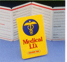 Designed to be carried at all times, this vital medical documentary allows recipeints to list: such as Name and address, Whom to call in an emergency, Doctor's name, Hospital of choice, Medical insurance, Medical conditions, Medicatation and dosage, Medicine allergies, Blood type, Organ donor and Location of documents. The size is 2" X 3 1/2" and up to 5 lines can be imprinted. Minimum imprintable quantity is 250.