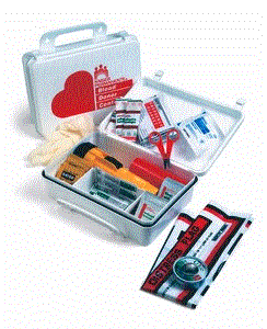 This unique, watertight case contains emergency blanket, flashlight with red safety cone attachment (requires 2 "D" batteries, not included), distress flag, 10 antiseptic towelettes, 6 Bayer aspirin packets, scissors, adhesive tape, 6 first aid cream packets, gauze, 6 Telfa pads, 24 adhesive strips and 1 pair latex gloves. Great for the car, truck, motor home, RV or boat. Measures 10" X 7" X 3 1/8". Minimum imprintable quantity is only 25.