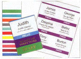 Color Bar Nametag Inserts are the perfect way to categorize and organize your attendees ! Great for large or multi-event meetings. These color-coded nametags make it much easier to identify different segments. the 1/2" color bar leaves plenty of room to laser print the name and information on these. Plus you can also print on the color bars. Have your name and logo custom imprinted on the stock. Available in a size of 4" X 3" only. Colors amy be mixed and matched to meet the minimum order of 500 Available with or without your custom imprint