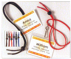 the Nametag Necklace is available in 6 bright contemporary colors.. They are 34" long with an adjustable cord lock for a proper fit. Available colors are royal blue, black, red, burgundy, purple and navy. A swivel clip for laminated nametags with punched slot may also be added. minimum omly 100.