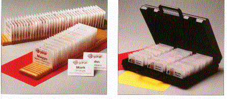 The wooden nametag organizer on the left holds 40 badges in alphabetical order. It makes for easy visibility of locating badges. It gives a neat appearance for the registration table. On the right the Clik Case Badge Case has a removable foam case that holds 60 badges. Each badge is spaced 1/2" apart. As your attendees arrive it is relatively easy to disburse the badges in a timely manner.