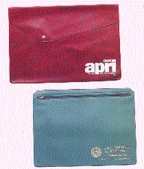 Portfolios are one of our most popular items for meetings, conventions, seminars and retreats. Below we have a Economy Snap Portfolio that measures 14 5/8" X 11". It features a brass snap to keep your importmant papers securely in place. Beneath it is the Zip Lock Portfolio that features a unique watertight, plastic zip lock closure with pull tab. It measures 14" X 10 1/4". Both of these portfolios are available in a variety of colors. Minimum imprintable quntity is 100.