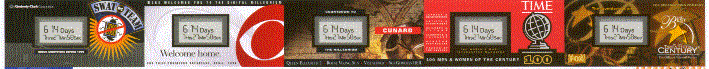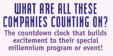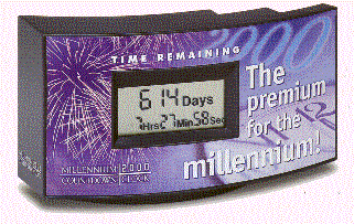 In days, hours, minutes, and seconds, the world's first Millennium countdown clock continuously displays the time remaining until the Year 2000. It's a unique and exciting way to promote any millennium program or event with dramatic, full-color, customized graphics. The Millennium Countdown Clock can be easily set for any of the world's 24 time zones and comes with a lithium battery guaranteeing uniterrupted operation through the millennium. And it's not just for the millenium -- it can also be set to display the time remaining for any special dates. anniversarys, launch date, event, premier, grand opening, you name it !!!