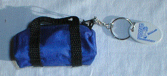 The Sport Bag Key Chain is great for coins or other small items and it measures 3" X 1 3/8" X 2" and is available in colors of either Red or Blue and the White disc can have your custom imprint on the White disc. Minimum imprintable quantity is 300.