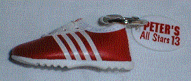 TheSneaker key chain is available in colors of either Blue or Red. It measures 3" X 1" X 1" and your imprint would be on the White oval disc. Minimum imprintable quantity is 300.