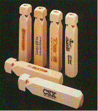 Here is a whistle with an authenic four tone sound. Crafted from pine wood and made in the USA. It measures 8" long X 1 1/4" deep X 1 1/4" wide. It can be customized by either pad printing or laser engraving. The imprint area is about 4" X 1". These train whistles are available with four blank sides or with a train illustration logo on one surface. You can customize one or more sides. Even though the imprint surface area is about 6" long by 1 1/4" deep our pad printer can only imprint an area of 4" long by 1" deep without any distortion. Less than $ 6.90 each in the minimum of 75.