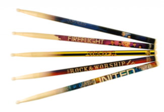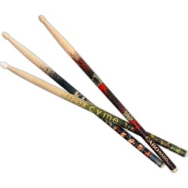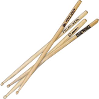 Professional quality 15 1/2" long maple drumsticks can be pad printed or laser engraved. Sold as a pair and packaged in a half paper sleeve.Less than $ 5.15 per pair in minimum imprintable quantity of 75 pair for pad printing or for laser engraved 75 pair is less than $ 8.90 per pair. Imprint area is 1/4" high X 4" long. The full color imprinted drumsticks in the right picture are less than $ 14 per pair in the minimum of 100 pair.